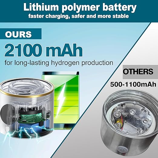 - 【High-Capacity Battery for Long-Lasting Operation】The ion bottles hydrogen water ionizer featuring a 2100mAh high-capacity battery, our design eliminates the need for frequent recharging, allowing you to produce hydrogen-rich water anytime, anywhere. Suitable for various environments such as the office, travel, or exercise. Unlike other bottles that use lithium-ion batteries, our cup utilizes a lithium polymer battery, offering faster, safer, and more stable charging.