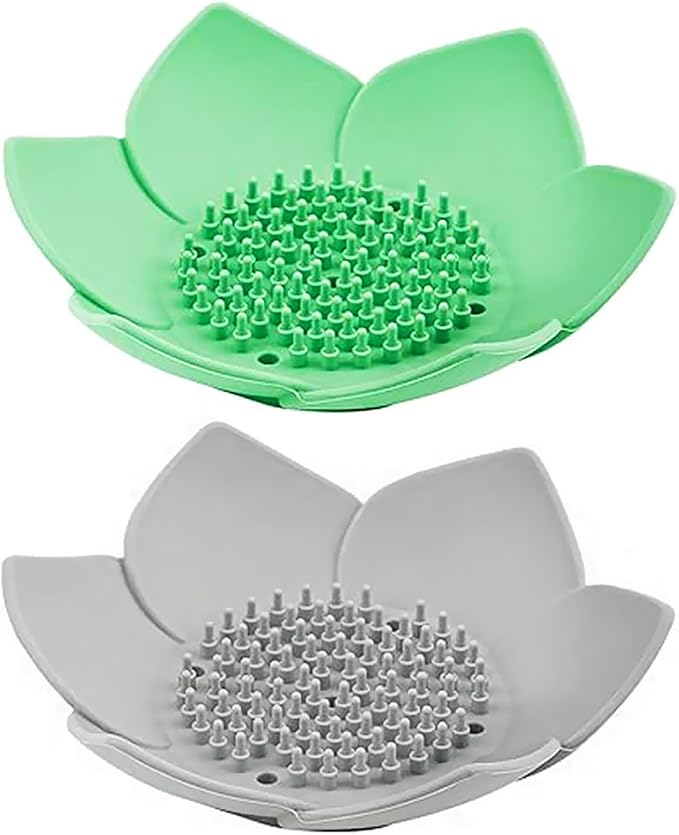 Draining Silicone Soap Dishes with Lotus Flower Shape Flexible (CushionPad-1Green1Grey)