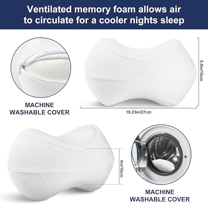- Comforts: The dual curves on our knee pillow is beneficial for side sleepers as it provides the separation necessary for optimal spine positioning and overall comfort while lying down