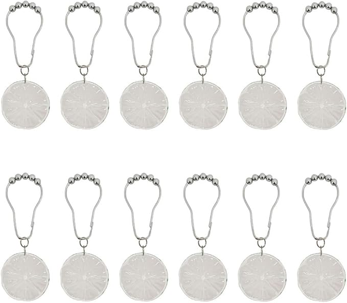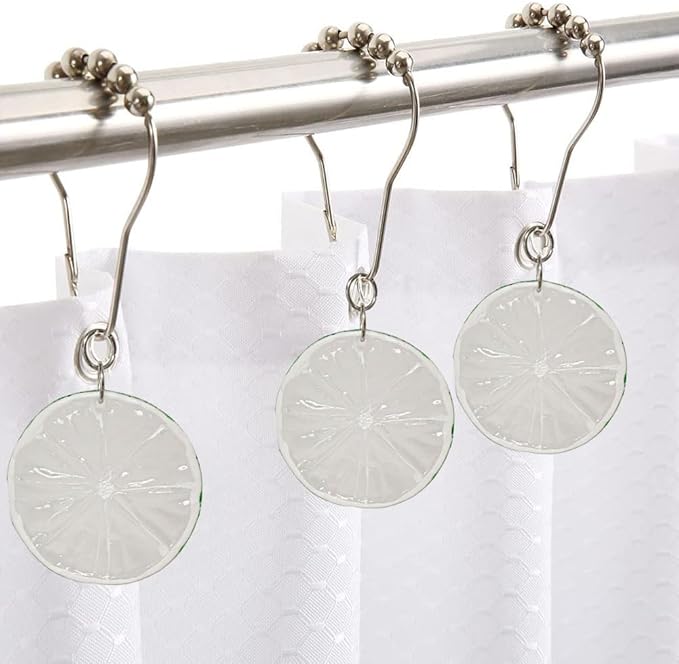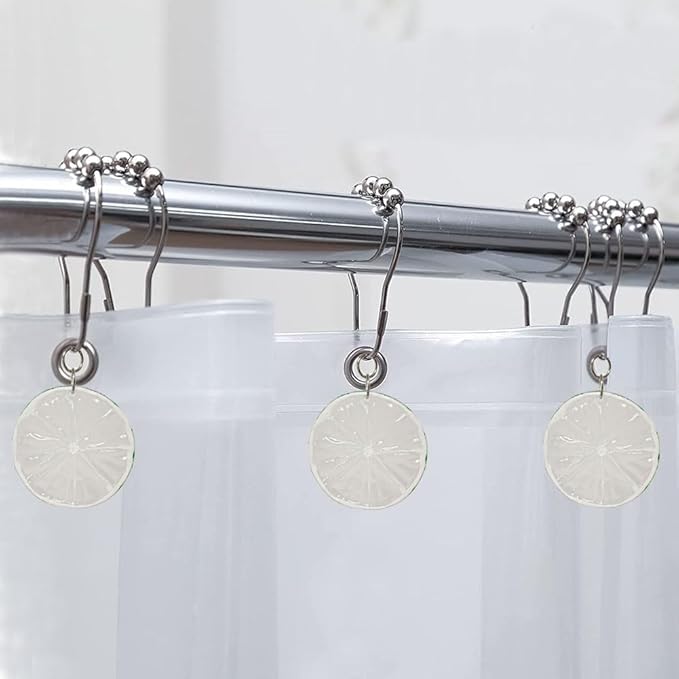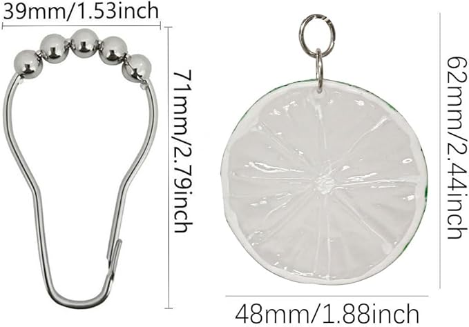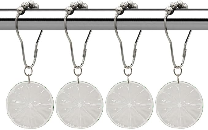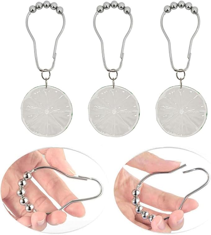 - QUALITY AND RELIABLE - Our rustproof shower curtain hook rings are made of high quality stainless steel, stainless steel is more rustproof durability than ordinary metal shower curtain hooks. it can be used for many years in a wet bathroom. Realistic resin lemon slice pendant