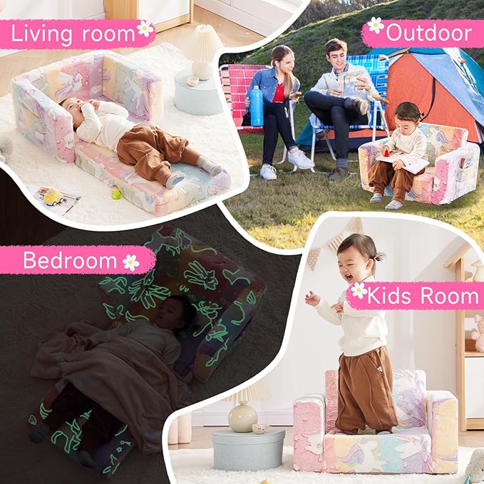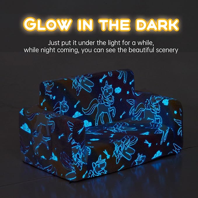 - 【Glow in the Dark】Our kids chair has a unique lighting design and features cute Unicorn and other patterns. To witness the magical glow, simply place the children's couch in bright light or sunlight for 10 to 15 minutes. In the dark, it shines. This toddler couches that fold out is the ideal gift for birthdays, Christmas or baby showers. It is also a unique toy for children.