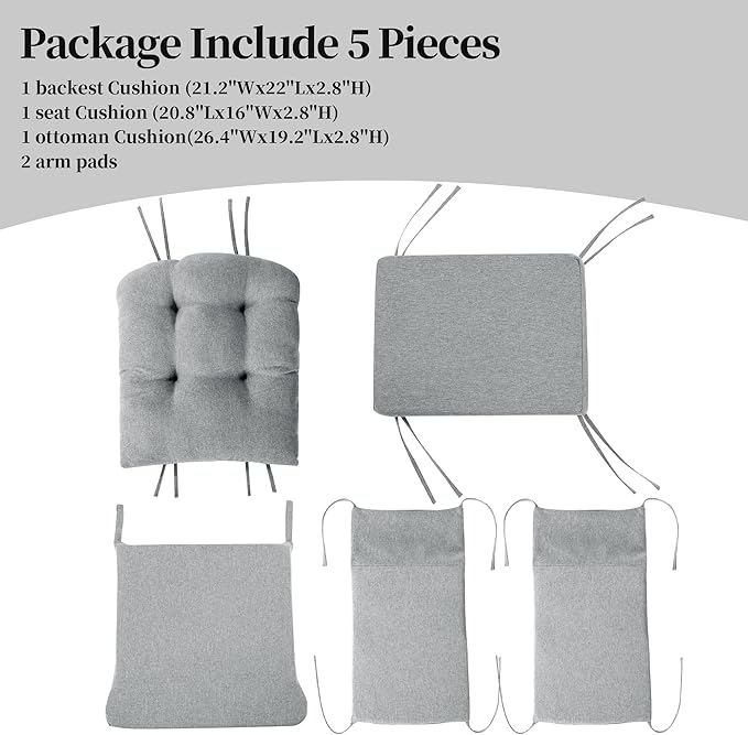 - 【Package Include】(NO Gliding Chair Included) Include 5 pieces. 1 backrest cushion (26.4*19.2 inches). 1 seat cushion (22"W*21.2"L*2.8"H). 1 ottoman cushion (20.8"W*16"L*2.8"H). 2 armrest cushions (13.2"L)