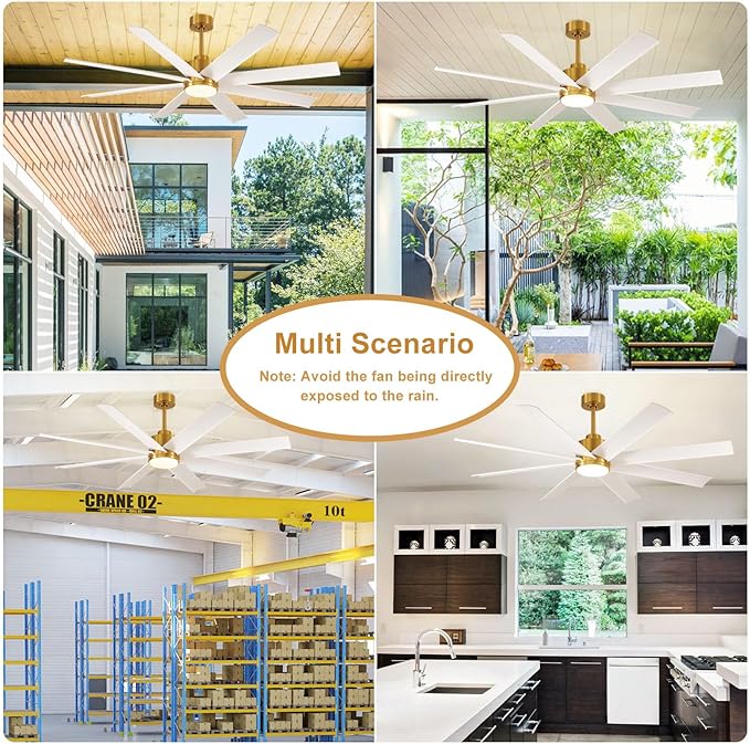 - Modern Industrial Design: This 72-inch large ceiling fan with lights, it with 8 pieces of fan blades, The charming pure White and metallic gold embellishments make the appearance of the ceiling fan very delicate, beautiful and advanced. Hang this ceiling fan with light, I believe it will instantly improve the aesthetic of your space. Fan blades made of ABS material have certain moisture-proof function, suitable for indoor or covered outdoor use ( living room, dining room, patio, bedroom, meeting room, hall, corridor etc )