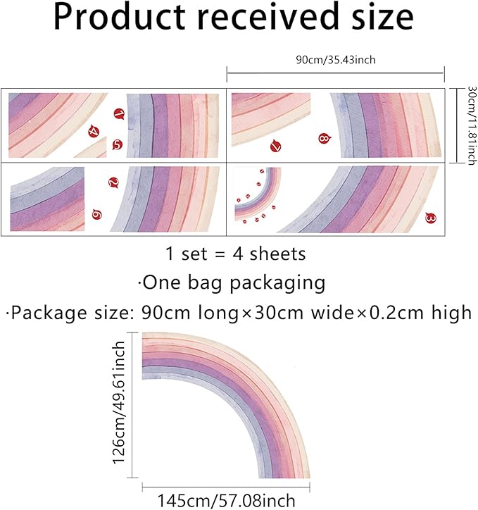 - 1. PACKAGE INCLUDE -- Get a vibrant burst of color with this Rainbow Wall Decal set, including one large waterproof and removable vinyl sticker measuring 49.61 inches by 57.08 inches. Perfect for adding a touch of magic to any room.