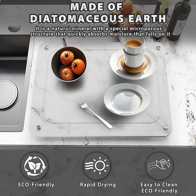 - 【Super Absorbent & Quick Drying】Kitchen Countertop Stone Dish Drying Mat is made of food-grade diatomaceous earth with super absorbent and moisture-absorbent properties that quickly absorbs water from the surface in seconds and dries completely in minutes, ensuring that your drying area stays clean and dry in minutes.