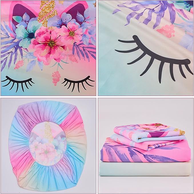 - 🦄【Design】Queen Size Bed Kids Sheet Set combine unicorn and flowers in rainbow background , create a warm and dreamy bedroom and bring more color and fun to life. Essential 3D unicorn toddler sets for bedroom decorations, you will find your kid getting a restful sleep on 3D toddler comforter sets.