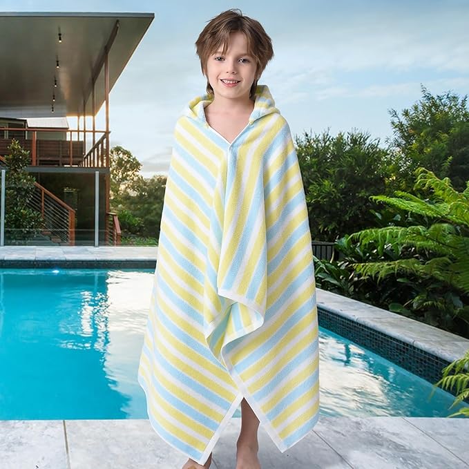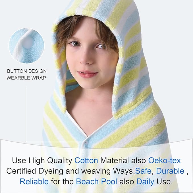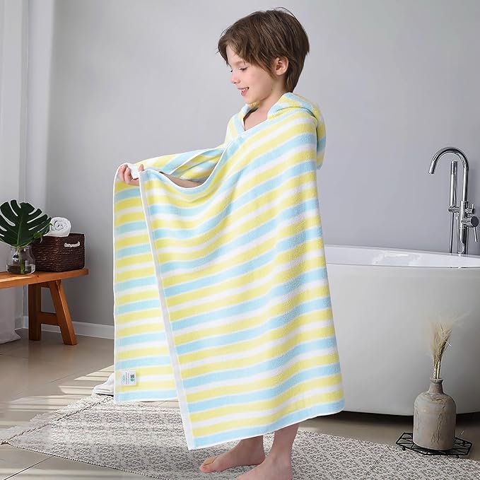 VOOVA & MOVAS Kids Beach Towels with Hood Lightweight - 100% Cotton (3-10Years) - Quick Dry Absorbent Towel for Pool | Swim | Beach | Bath, Boys Wrap Towel with Hood, Yellow Blue Stripe