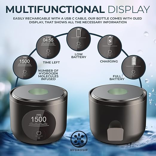 - Smart Design with OLED Display: This water hydrogenator bottle is not only performant and portable but also smart and user-friendly. The OLED display allows easy access to the bottle settings while the single button ensures effortless hydrogen infusion with just a touch.