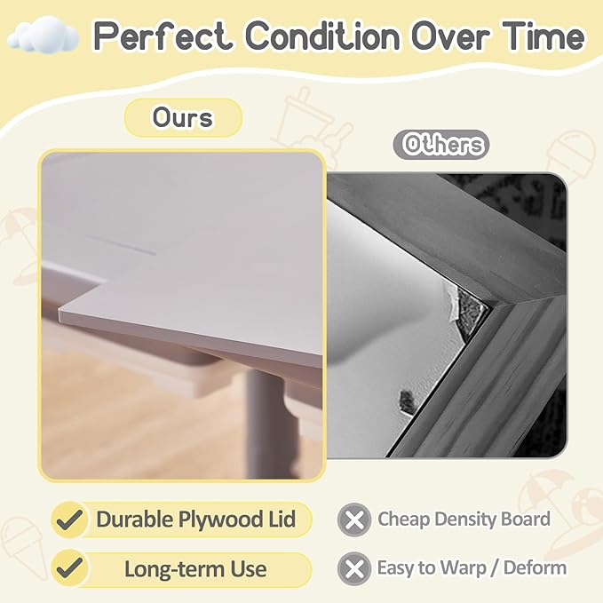 - 【Plywood Board VS. Density Board, Say Bye to Warping and Deformation】Are you concerned about your sensory table top warping or deforming over time? Worry no more! Compared with ordinary density boards, FUNLIO kids sensory table cover is crafted from high-quality plywood, ensuring it remains sturdy and resistant to warping. This means your sensory table will stay in perfect condition to accompany them through countless hours of play.