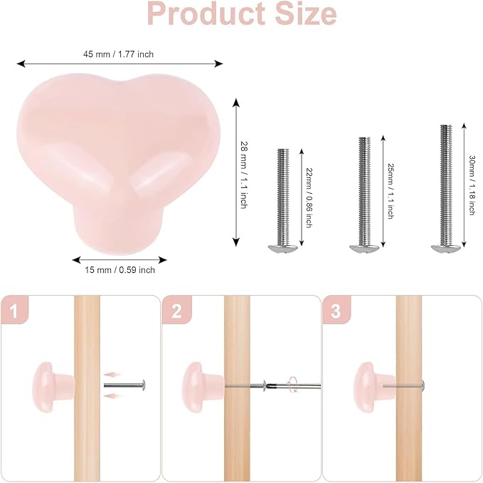 - Color: Pale Pink, Knob Size: 45x28x15mm/1.77x1.1x0.59inch; Each heart ceramic cabinet knob comes with 3 different sizes of screws. The kid's dresser knob is a new way to spice up a boring closet and bring a lively flair especially into the children's room.