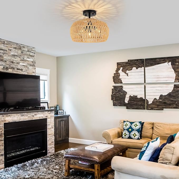 - 360° Light Effect: The coastal rattan ceiling lamp casts 360° light effect shadow through the holes and provides a cozy soft glow when turn on. Elegant and beautiful accent lighting for living room, bedroom, kids room, kitchen, farmhouse, nursery