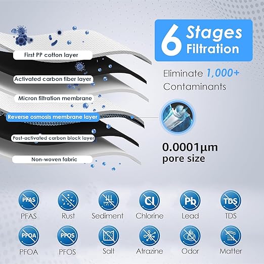 - 𝟔-𝐬𝐭𝐚𝐠𝐞 𝐜𝐨𝐦𝐩𝐨𝐬𝐢𝐭𝐞 𝐟𝐢𝐥𝐭𝐞𝐫&𝐞𝐟𝐟𝐞𝐜𝐭𝐢𝐯𝐞 𝐟𝐢𝐥𝐭𝐫𝐚𝐭𝐢𝐨𝐧: Waterdrop D6 RO system adopts advanced filtration technology. With an accuracy of 0.0001 μm, the 6-stage filter reduces most contaminants from water, including salt, atrazine, nitrates, PFAS, lead, sodium, chromium, etc. Two coconut carbon block layers reduce chlorine, taste, and odor to improve the water taste. Two PP cotton layers intercept sediment, rust, suspended solids, and other large particles.