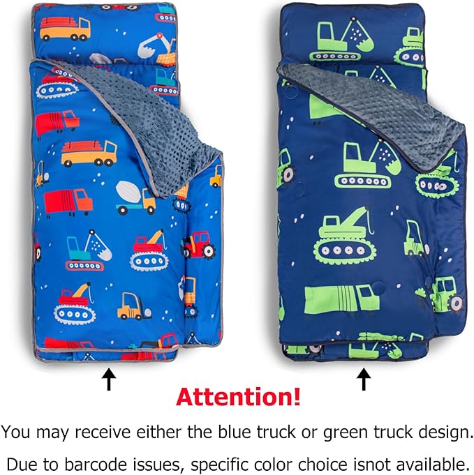 Nap Mat- Toddler Nap Mat with Pillow & Fleece Blanket- 55''*23''*2'' Nap Mat for Toddlers- Nap Mats for Preschool, Daycare(Rubber Band Style Blue Excavator)