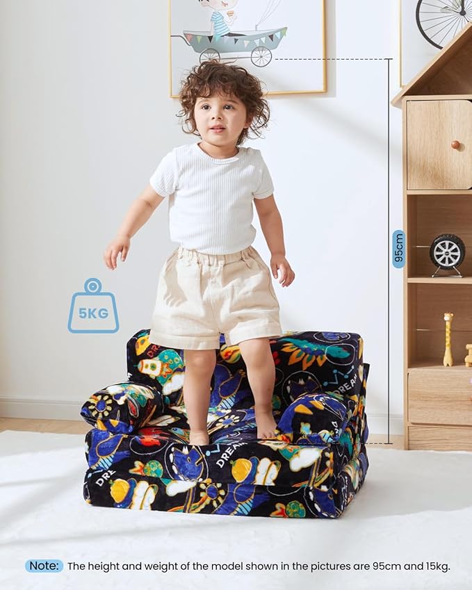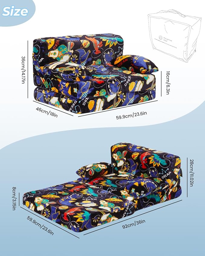 - 【Size & Age】23.5"L x36"Wx16"H | Lounger size when flipped open: 23.5"L x18"Wx16"H | 2 sizes for you to choose: "S" for 1 children under 5-year-old and "M" for 2 children under 5-year-old. When you go camping during the summer, it would be a great idea to bring this soft 2-in-1 kids couch for your kids to sleep on! This toddler sofa not only provides functional seating, but also adds fun to your child's bedroom or playroom decor.