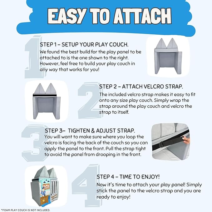 - ADJUSTABLE VELCRO STRAP - Each panel comes with an adjustable velcro strap. The strap makes it easy to wrap around play couches of all sizes. Don't have a play couch? Let your kids use couch cushions to build their forts!