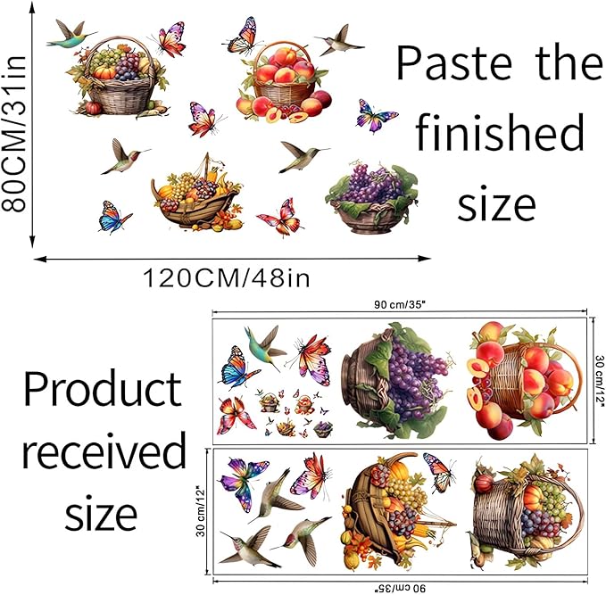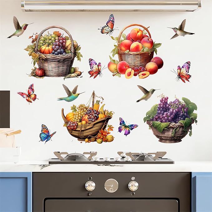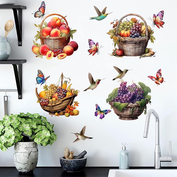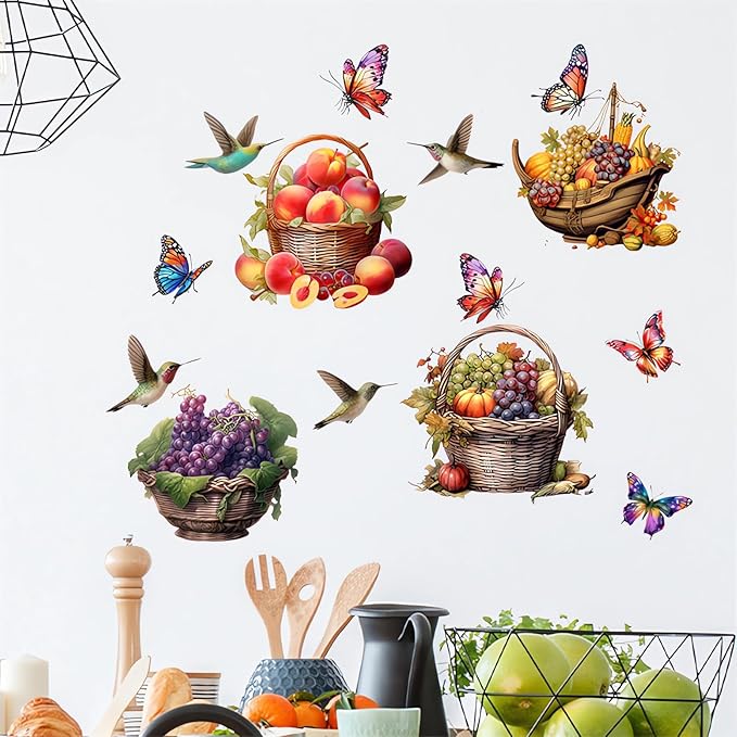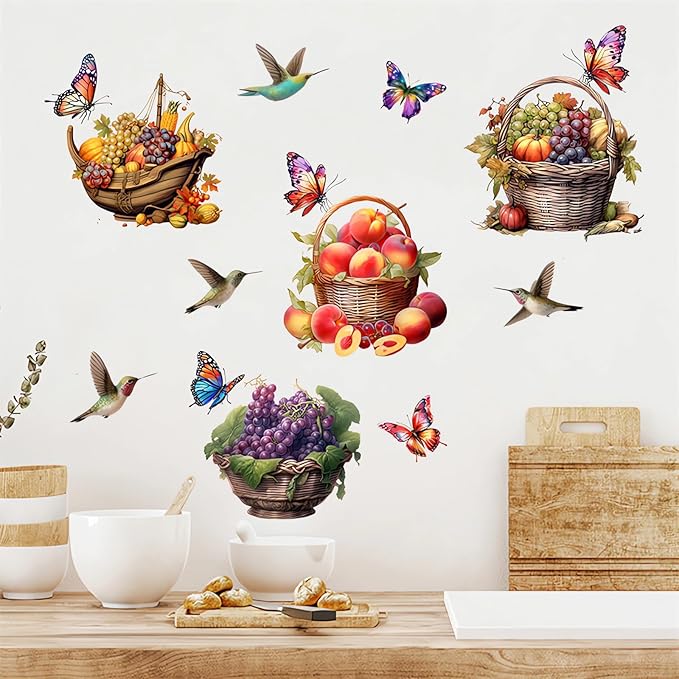 Colorful Fruits Basket Butterfly Hummingbirds Wall Stickers, sacinora Grapes Peaches Pumpkin DIY Wall Decals Removable Vinyl Peel and Stick for Kitchen Living Room Bedroom Art Home Decorations