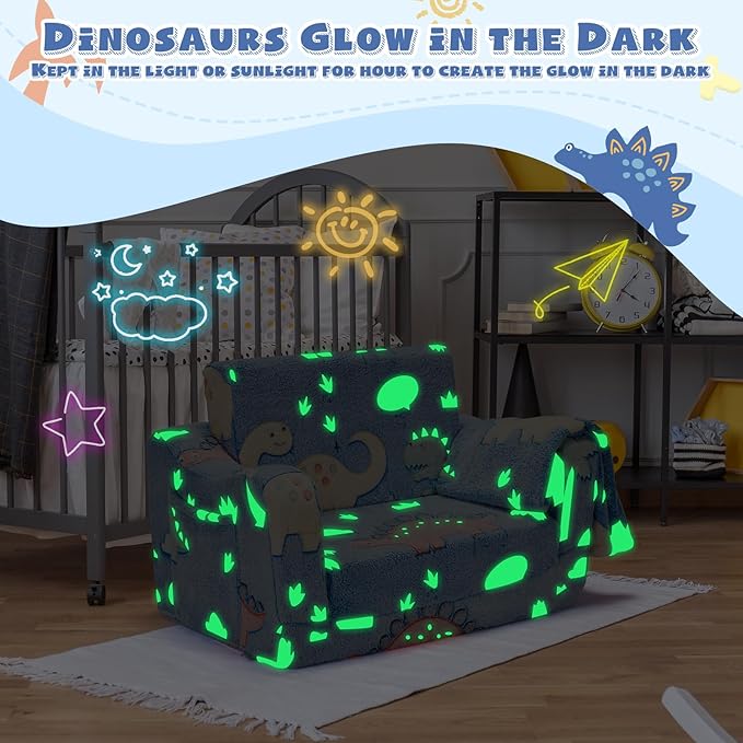 - GLOW IN THE DARK: Let your child's imagination take flight with our versatile toddler couch fold out, just put it in the sun (like charge the glow) or kept in the light for 3-5 hours, and partial pattern glows beautifully in the dark, creating a unique and cozy atmosphere. Perfect for reading, TV watching, or kicking back for family time,etc