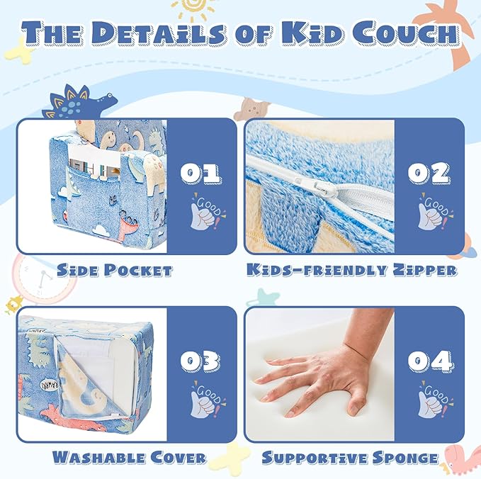 - THOUGHTFUL CUTE FEATURE:1.Product Weight only 5 LBS, kids can move it around easily; 2.Side pockets store books and toys within easy reach. 3.Ergonamic armrest and recline backrest help kids practice sitting for reading. 4.It came vacuum sealed and pre-assembled, with no chemical odor and just took a day to fluff up. It is very suitable as a birthday gift, Christmas gift and baby shower gift.