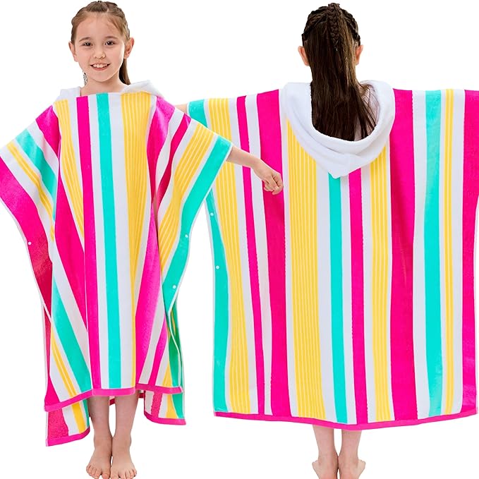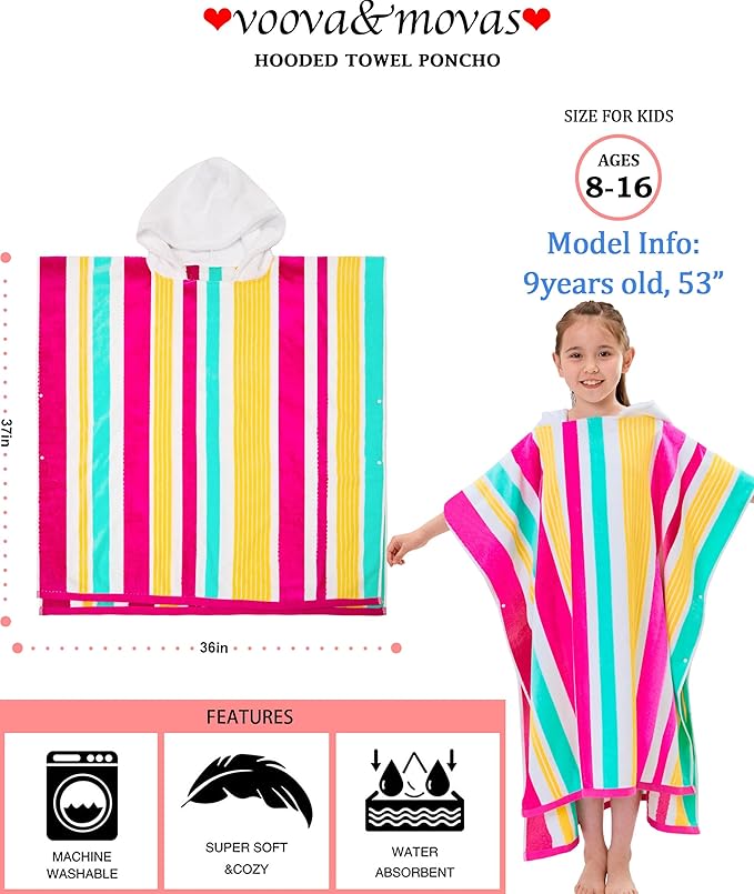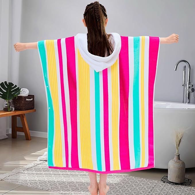 VOOVA & MOVAS Big Kids Cotton Poncho Towels with Hood (8-16Years), Thick Poncho Towel Robe for Kids, Perfect for Pool, Beach, Bath and Gifts, Red Green Yellow Stripe