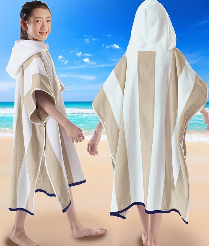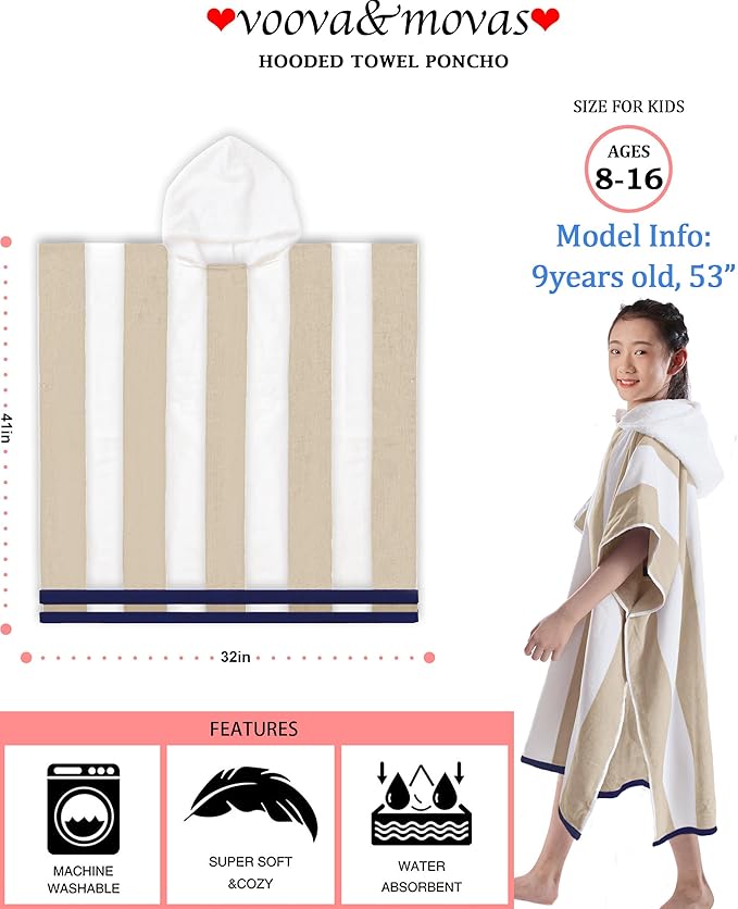 VOOVA & MOVAS Hooded Beach Towels for Boys| Girls | Teens (8-16Years), 100% Cotton Thick Poncho Towel Robe for Kids, Perfect for Pool, Beach, Bath and Gifts, Beige Stripe