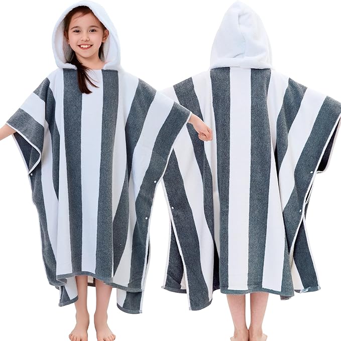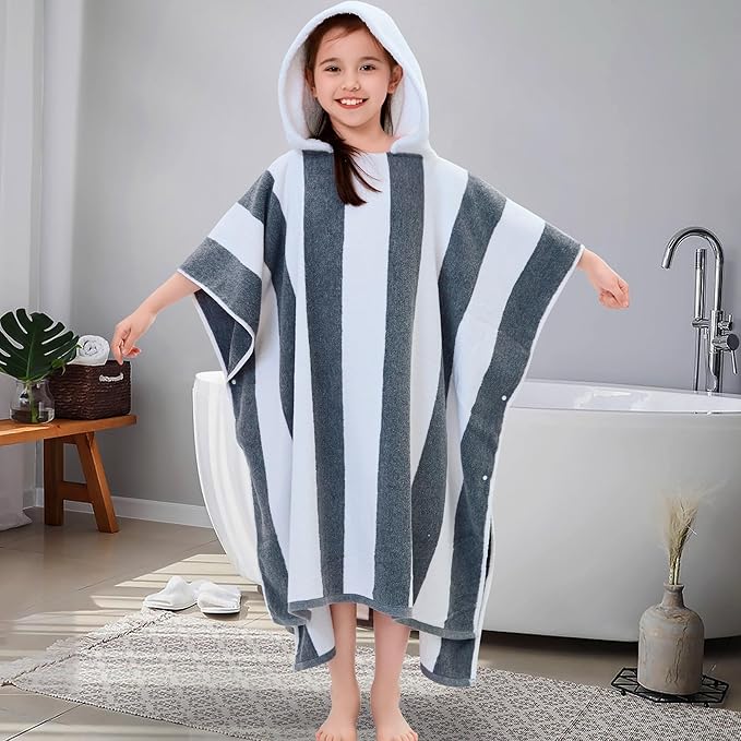 VOOVA & MOVAS Quick Dry Hooded Poncho Towel for Teens (8-16Years), 100% Cotton Thick Poncho Towel Robe for Kids | Boys, Perfect for Pool, Beach, Bath and Gifts, Gray White Stripe