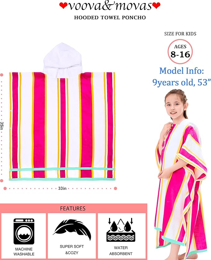 VOOVA & MOVAS Hooded Beach Towels for Boys| Girls | Teens (8-16Years), 100% Cotton Thick Poncho Towel Robe for Kids, Perfect for Pool, Beach, Bath and Gifts,Red Yellow Stripe