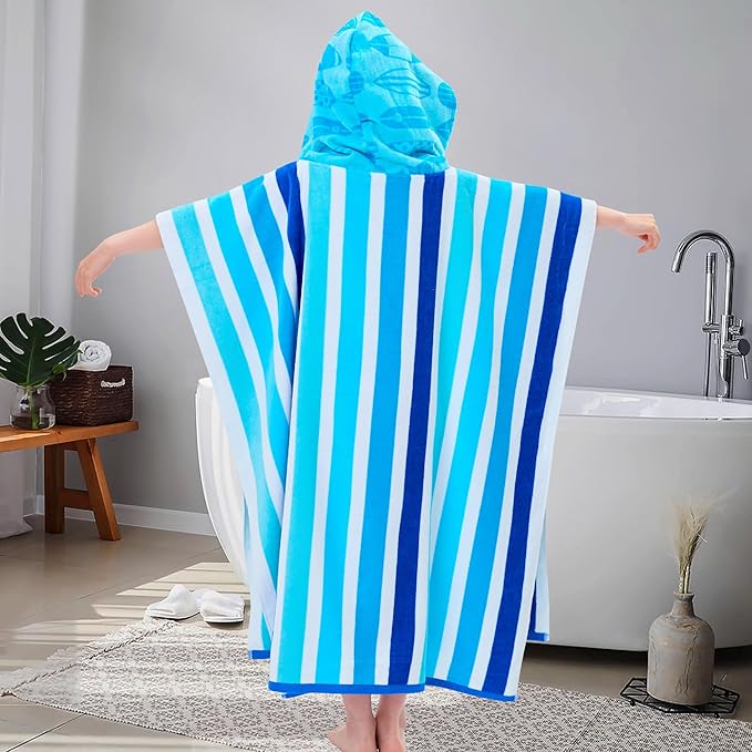 VOOVA & MOVAS Teens Poncho Towel with Hood (8-16Years), 100% Cotton Thick Poncho Towel Robe for Teens, Perfect for Pool, Beach, Bath and Gifts,Blue Stripe