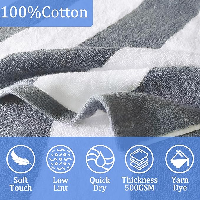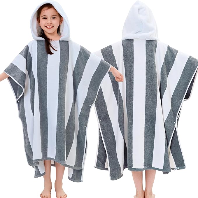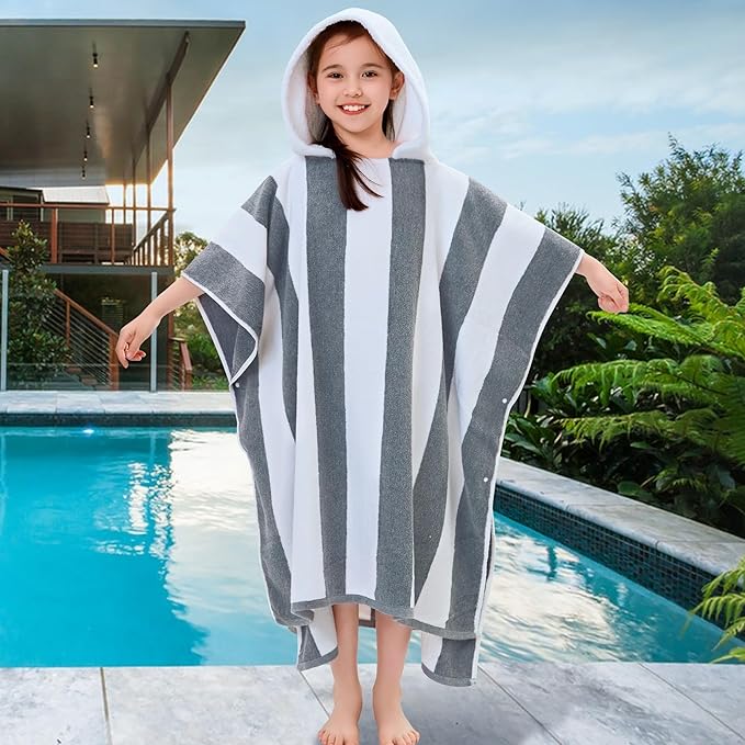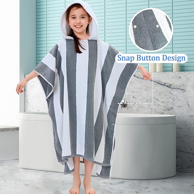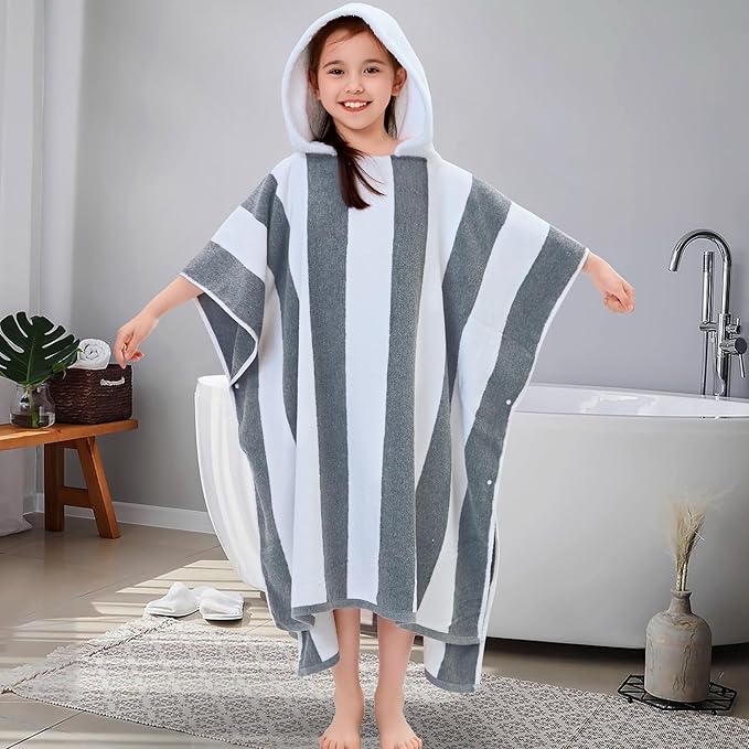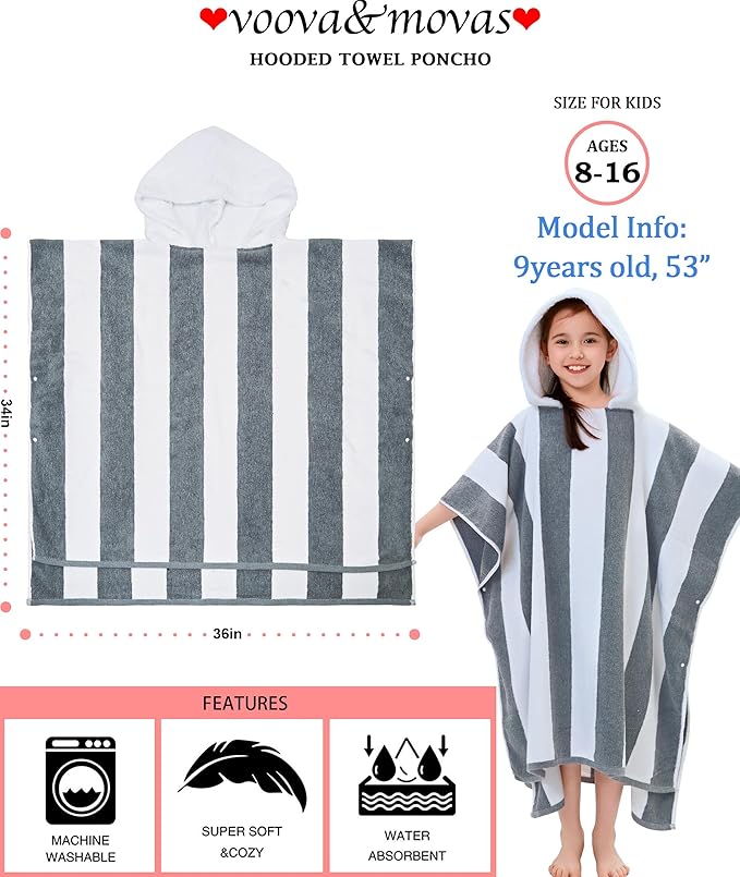 VOOVA & MOVAS Quick Dry Hooded Beach Towels for Boys| Girls | Teens (8-16Years), Absorbent 100% Cotton Thick Poncho Towel Robe for Kids, Perfect for Pool, Beach, Bath and Gifts, Gray White Stripe