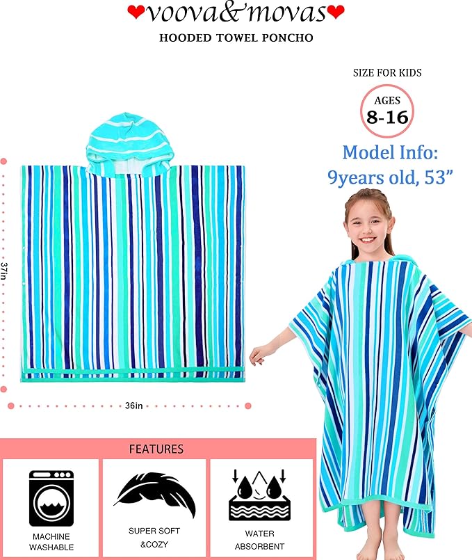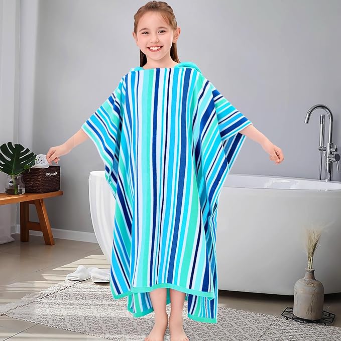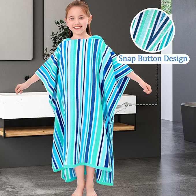 VOOVA & MOVAS Teens Hooded Poncho Towels (8-16Years), 100% Cotton Thick Poncho Towel Robe for Kids, Perfect for Pool, Beach, Bath and Gifts,Blue Green Stripe