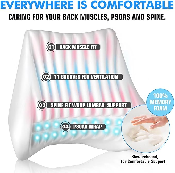 - 【Comfortable Memory Foam & Lumbar Massage】The TKLoop Lumbar pillow is lined with high-quality,high-softness memory foam that provides a perfect fit according to different body types.The central area of the lumbar pillow has multiple massage points for deep lumbar massage.The unique 11 ventilation slot design can prevent lumbar blood vessels from being compressed when leaning too much, relieve lumbar pressure, and improve lumbar breathability.Soft outer cover provides a comfortable feeling in all seasons.