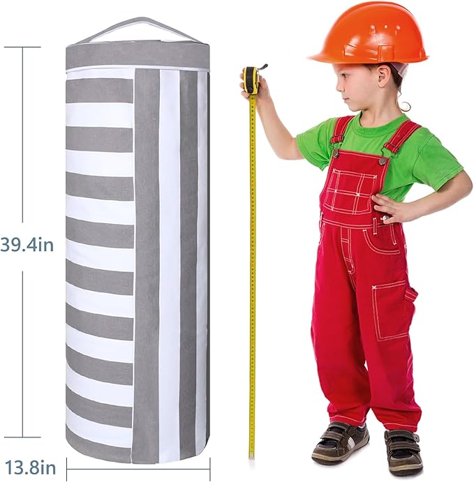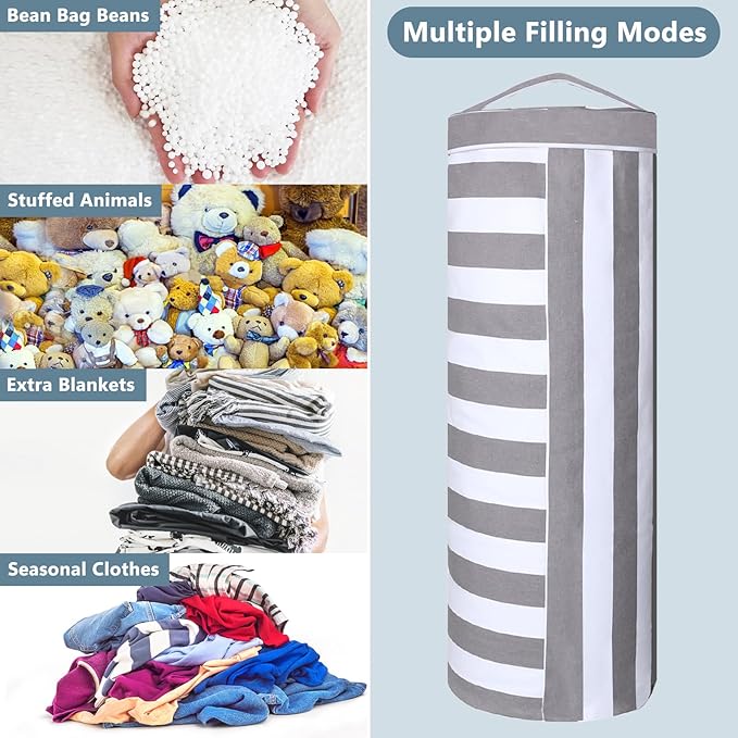 - [Cylindrical Design - Save Space - Increase Interactivity between Children] This stuff animal organizer is designed to be cylindrical and can be stored in corners. Compared to ordinary stuffed animal storage products, it better utilizes vertical space and saves more floor space. Because it is a long strip, it allows two children to sit on our cylindrical bean bag and play together, increasing interaction between children; Stripe color scheme, simple and versatile, can well integrate various home.