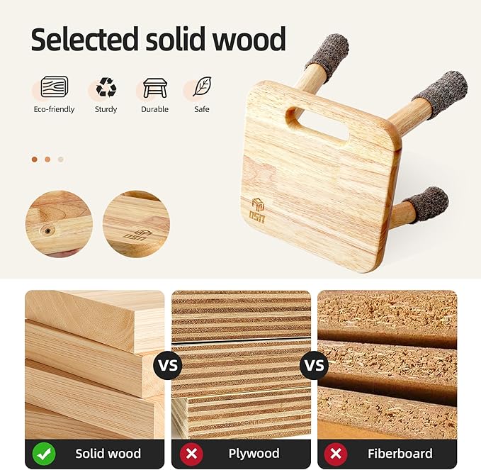- 【Sturdy Wood Step Stool】This 100% wooden step stool is sturdier and more durable than plywood, fiberboard, or plastic. To enhance its weight-bearing capacity, we increased the stool's thickness to 0.985 inch, further reinforcing its strength. Your safety is our top priority. Dimensions: 9.5L x 9.5W x 9.5H inches. Max load: 300lbs.