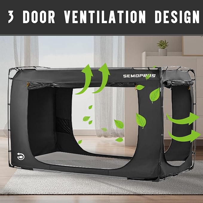 - GOOD VENTILATION:The twin bed tent has three doors for easy access - two on the sides and one at the end. It features a double-layer design with mesh windows for airflow and blackout fabric, both with double-sided zippers. The floorless design makes cleaning and organizing the bed easy, while providing a private space to enjoy.