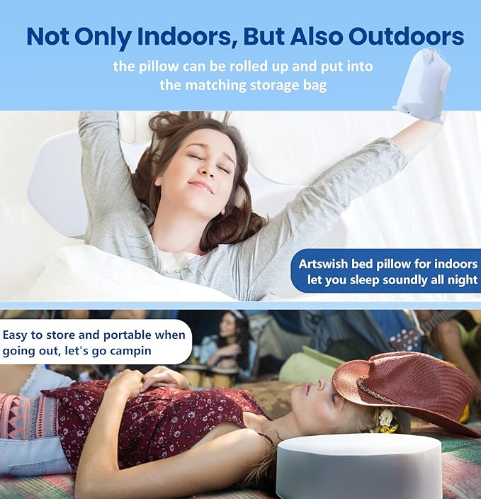 - 🌙【The Portable Feature Allows It To Be Used Not Only Indoors】Artswish memory foam pillow weighs 2.2 pounds (1kg) and can be rolled up and put into the matching travel storage bag. You can easily carry it outdoors and it will become an excellent necessity for your camping trip. After unfolding the pillow, you can enjoy sweet dreams outdoors.