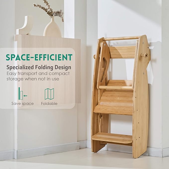 Toddler Tower Foldable Kids Kitchen Step Stool, Folding Learning Tower for Toddlers 1.5-6 Year with Safty Rail, Montessori Standing Tower with 3 Adjustable Heights, Natural Bamboo