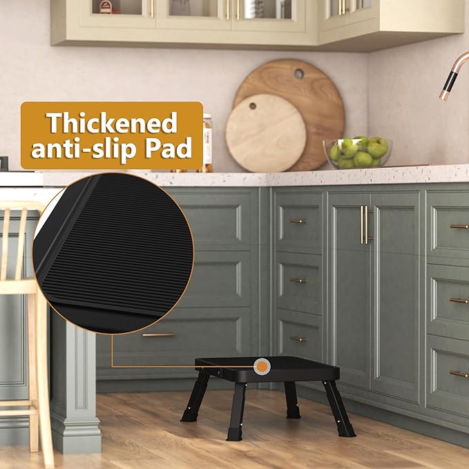 - 【Indoor Outdoor Use & Multifunctional】 Folding foot stool with a space-saving design is perfect for kitchen, bathroom, bedroom, office, utility room, dining room, garden, garage, or outdoor camping, RVs, fishing, etc. Folding one step ladder can be used as a kitchen step stool, bathroom step stool, bed step stool, closet step stool, office folding stool, or as a temporary seat for outdoor activities. Adjustable foldable stool is a must-have tool for every family