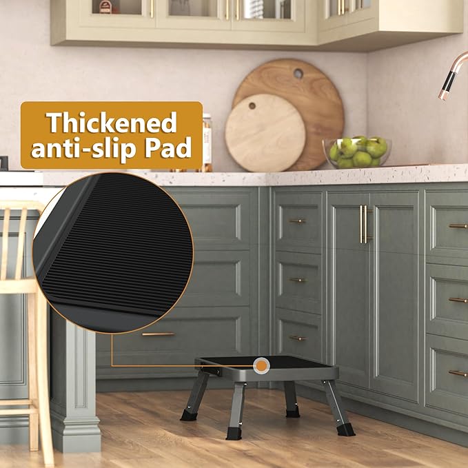 - 【Sturdy and Durable & Safety & Non-Slip】 Foldable step stool is made of rust-resistant paint and heavy duty thickened alloy steel, which is waterproof, easy to clean, scratch-resistant, environmentally friendly, and durable. Foldable stepping stool with a fully covered non-slip rubber pad and double safety locking buttons to increase stability, providing you with a reliable and safe stepping platform