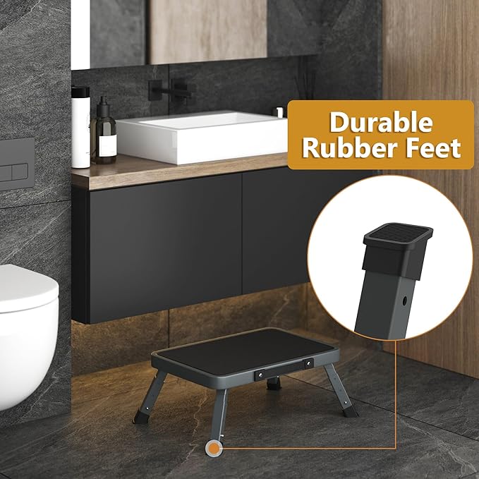 - 【Indoor Outdoor Use & Multifunctional】 Folding foot stool with a space-saving design is perfect for kitchen, bathroom, bedroom, office, utility room, dining room, garden, garage, or outdoor camping, RVs, fishing, etc. Folding one step ladder can be used as a kitchen step stool, bathroom step stool, bed step stool, closet step stool, office folding stool, or as a temporary seat for outdoor activities. Adjustable foldable stool is a must-have tool for every family