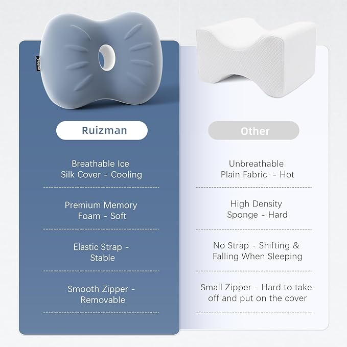 - <Cooling Touch> The pillowcase of the knee pillow for sleeping is made of cooling ice silk, providing a cool feeling for hot sleepers. The elastic strap is freely stretched to hold the pillow for between the knees while sleeping. The butterfly shape perfectly fits the body type and different sleeping positions.