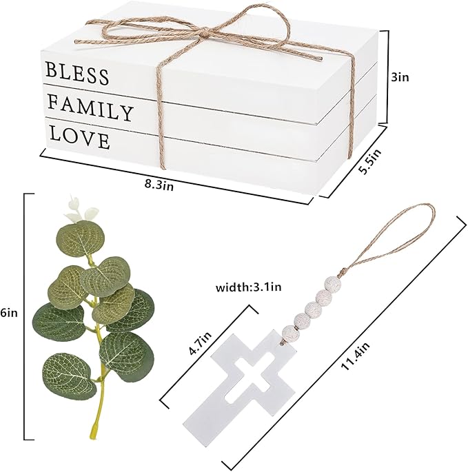 - PACKAGE: The package contains a set of wooden decorative books, wood bead garland with cross, and artificial eucalyptus leaves