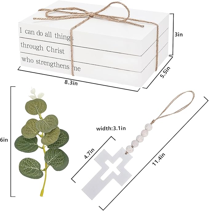 - PACKAGE: The package contains a set of wooden decorative books, wood bead garland with cross, and artificial eucalyptus leaves