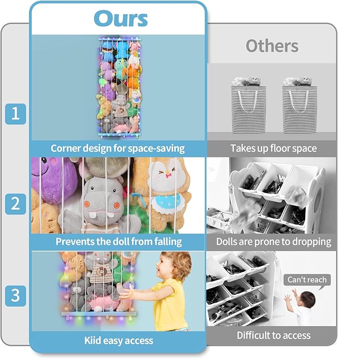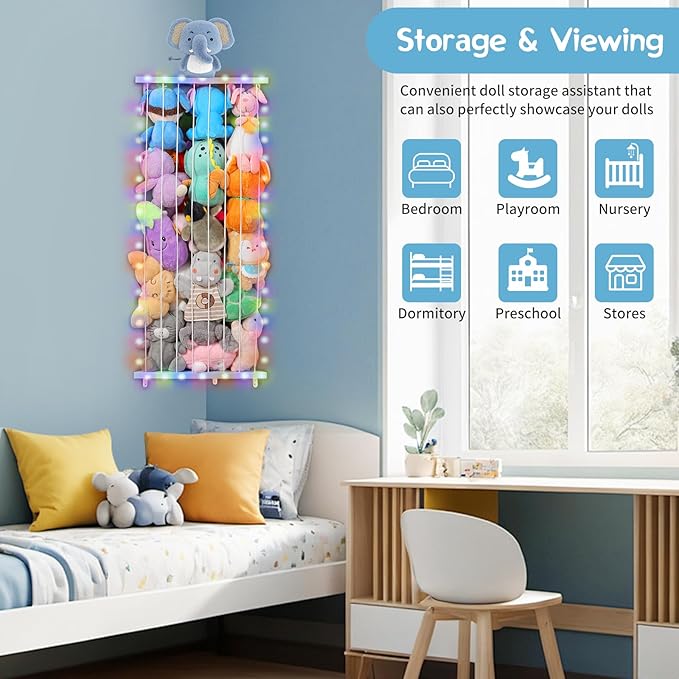 - Practical & Decorative: This stuffed animal wall holder comes with LED string lights(19.7 inches 50cm, requires 3 batteries - not included), which is great for display and store cuddly plush toys. Light can create a cozy and comfortable atmosphere, kids will be more relaxed.