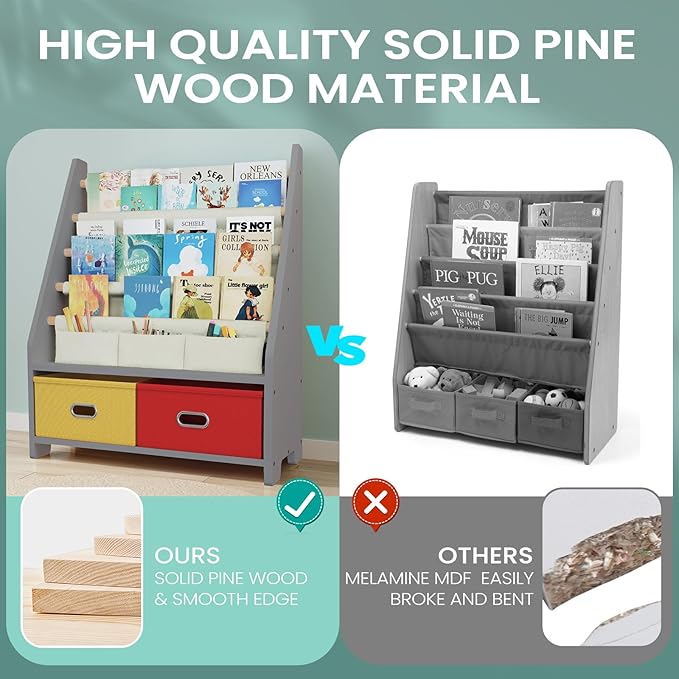 - NATURAL SOLID WOOD: Not like Melamine MDF as unpleasant smell, easily broke and bent, the broken residue will hurt children, this kids bookshelf is selected with high-quality natural solid pine wood which can completely eliminate these problems, it's durable and safe; paint-free design without any irritating and harmful odor.