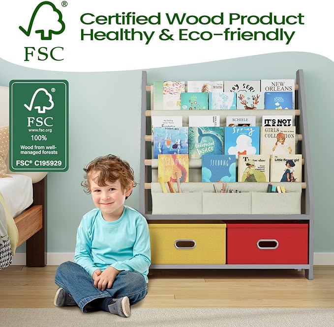 - CHILD-FRIENDLY DETAILING: All solid wood material of this kids book shelf is hand-made and polished, careful polishing of edges and corners, sleek edges and rounded corners minimize the risk of bumping or scratching. The sling bookshelf adopts stronger and wear-resistant cotton linen canvas for durable and attractive.A great toy and book organizer for kids, boys, girls, toddlers and children.