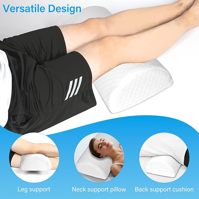 - MULTIFUNCTIONAL DESIGN: Versatile shape makes it usable as an under knee pillow, half moon neck pillow, leg pillow for lower back pain, and lower back pillow for sleeping.It can be used as a pain reliever positioning pillow, bolster pillow for side sleepers and back sleepers, during pregnancy or after surgery. Provides therapeutic support in multiple areas of the body.