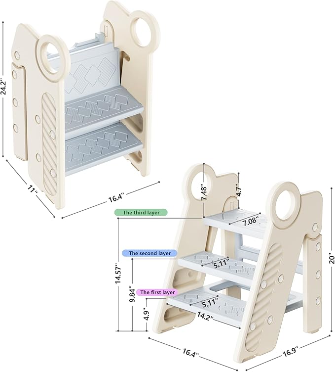 - Innovative 3-Step Design for Kids: This toddler step stool is thoughtfully crafted for children's growing needs. The dual-height levels (5.2" and 10.2",15.8“) and broad 10" steps make it versatile for various uses, including potty training, hand washing, and reaching kitchen areas.
