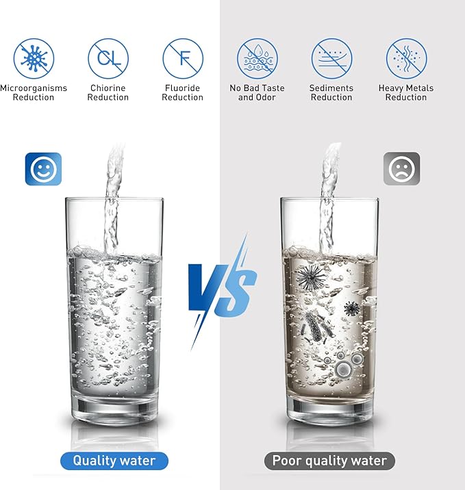 - [Exceptional Water Quality]: When it comes to ensuring the purity of your drinking water, our filter delivers excellent filtration performance. The filter's activated carbon core, crafted from high-quality coconut shells, ensures maximum absorption of impurities. This includes harmful contaminants like chlorine, heavy metals, sediment, rust, and odor, leaving you with crystal-clear and refreshing water.