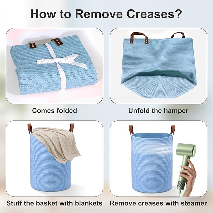 - Note: Laundry basket rope comes in a folded package and will have creases. You can use an iron to adjust the shape, or fill the rope blanket basket with blankets, clothes and wait for 1-2 days, which can help the rope basket to regain its shape