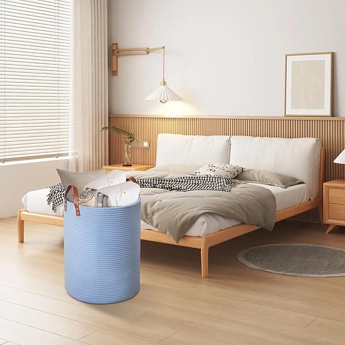 80L Large Rope Basket, Woven Rope Storage Basket with Leather Handles, Dog Toy Storage Basket, Bedroom, Nursery Blanket Storage, Bathroom Laundry Basket, 16“x20” Tall Rope Basket (Blue)