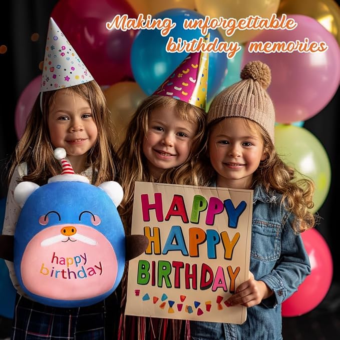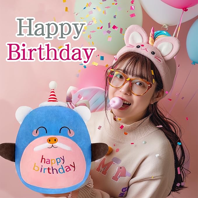 - 💙ORIGINAL DESIGN: This Birthday Pig Plush Pillow is a Loren J Designer Original! A brightly colored birthday hat, smiling eyes that make you feel happy, and the words "Happy Birthday" embroidered on his belly are all elements that add to the unique charm of this birthday pig. Add the Birthday Pig Plush Pillow to your plush pillow collection!